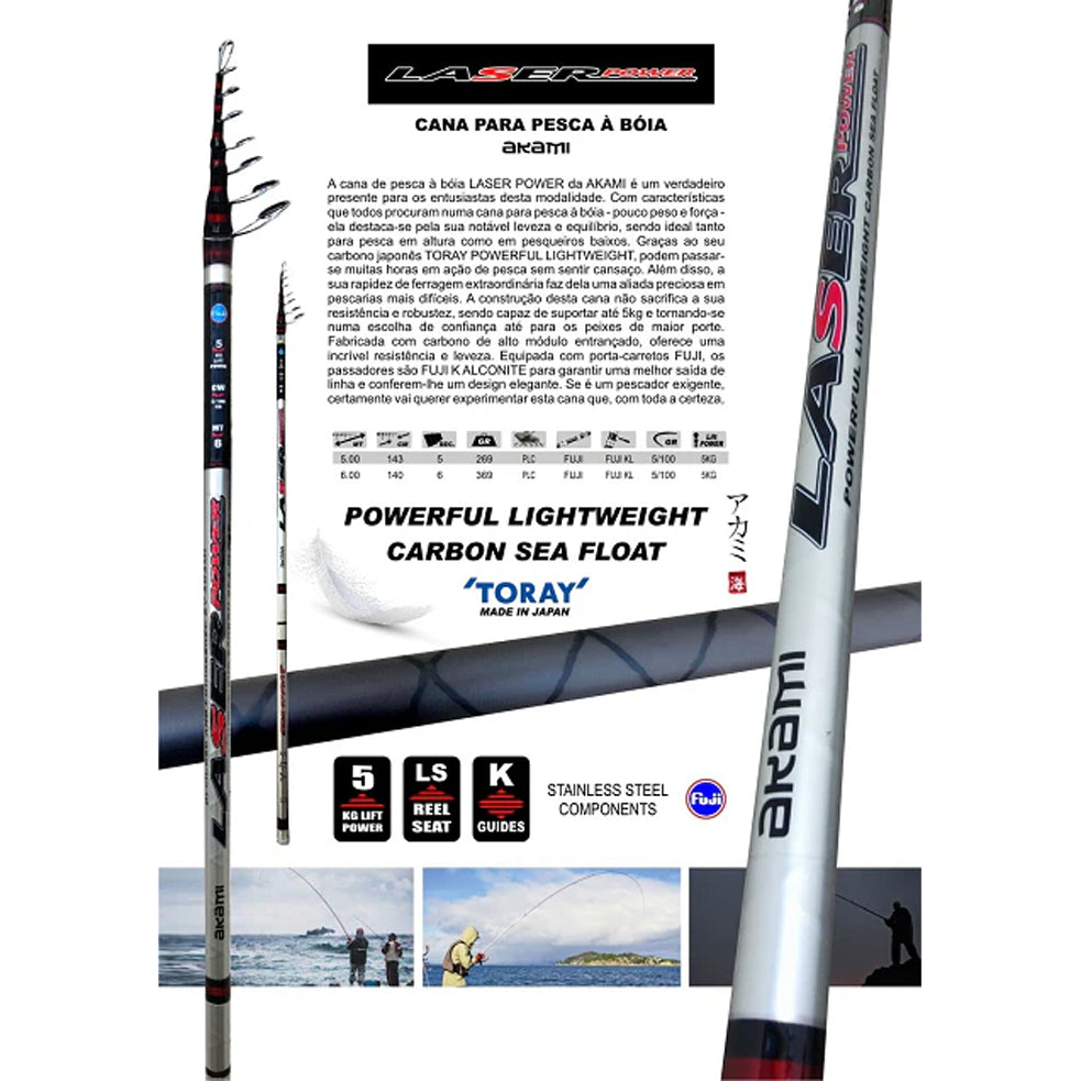 A Akami Laser Power foi desenhada para pescadores de boia que procuram leveza, rapidez e precisão nas ferragens. Construída em carbono japonês de alta qualidade, oferece uma sensibilidade excecional, mantendo ao mesmo tempo força suficiente para lidar com peixes mais robustos.